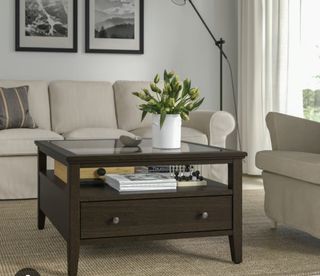 Preciosa mesa de centro de la marca Ikea, modelo Idanas. Es de color marrón oscuro y tiene un diseño elegante y sobrio. - Superficie de cristal. - Un cajón para guardar objetos. - Estructura de madera robusta.