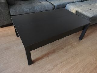 Mesa de centro elevable de IKEA, con un acabado en color marrón oscuro (wengue). La mesa está en buen estado y bien cuidada. En un lateral tiene un pequeño desperfecto que fue restaurado aunque se nota un poco.
