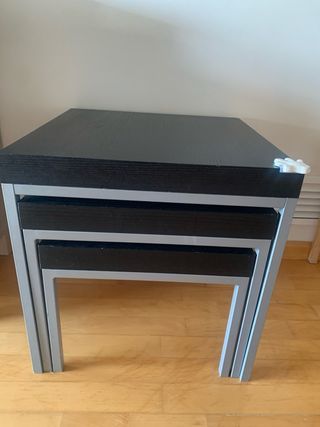 Conjunto de tres mesas nido con un diseño moderno y funcional. Perfectas para optimizar el espacio en cualquier estancia. - Acabado superior en madera oscura. - Estructura de metal en color gris. - Se apilan fácilmente una dentro de otra. las medidas son: Alto (grande, mediana y pequeña): 50, 42, 33 Ancho y fondo igual (grande, mediana y pequeña): 50, 45, 40.