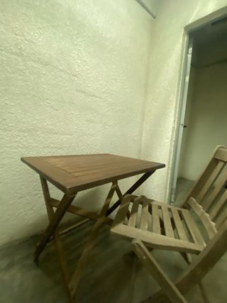 Mesa y silla de madera de Ikea, en buen estado. Son ideales para un balcón o una terraza pequeña. - Mesa plegable de madera. - Una silla a juego.