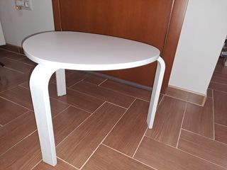 Mesa auxiliar de madera, de forma ovalada. Es de color blanco y está en buen estado. - Perfecta para espacios reducidos. - Diseño sencillo y elegante. - Ideal como mesita de centro o auxiliar.