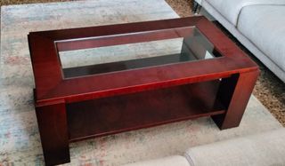 Elegante mesa de centro para salón. - Tablero superior de cristal. - Estructura de madera oscura. - Diseño moderno y funcional.