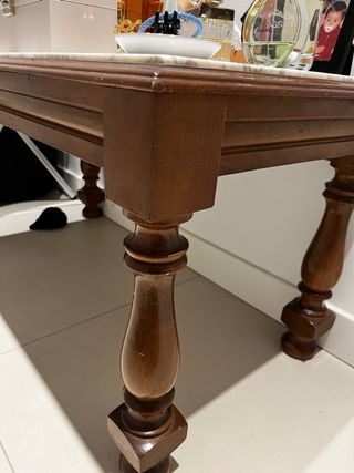 Elegante mesa de centro con un diseño clásico. - Tablero de mármol con veteado natural. - Estructura y patas de madera con acabado oscuro. - Bordes decorativos tallados. Precio negociable.