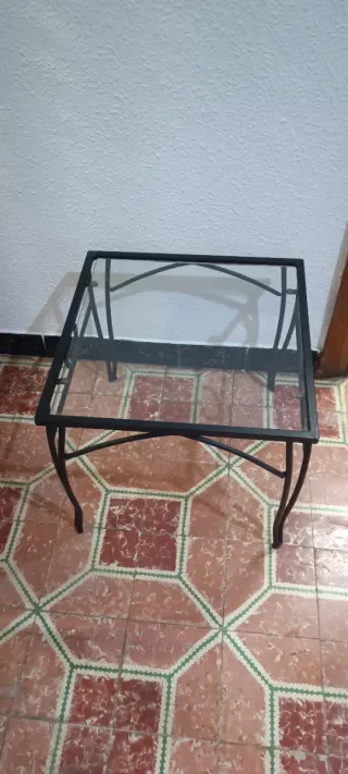 Elegante mesa auxiliar con estructura de forja y tapa de cristal. Desperfecto en el cristal se ve en la foto. - Diseño moderno y versátil. - Patas curvas con detalles decorativos.