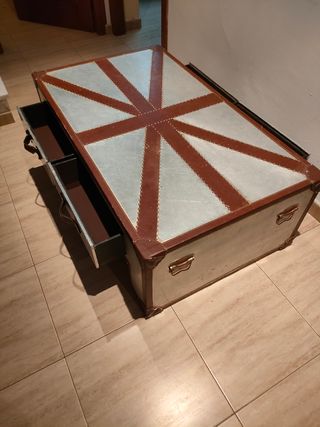 Mesa centro tipo baúl,material chapa y cuero. Con dos cajones por cada lado, resistente y original,se vende por cambio de mobiliario.