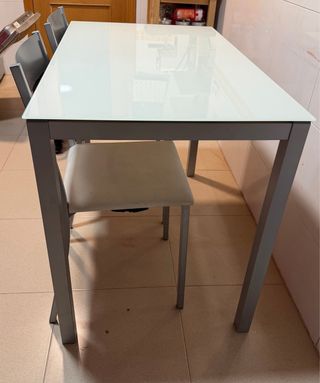 Conjunto de mesa de cocina con sobre de cristal y tres sillas. - Mesa extensible con estructura metálica. - Sillas con asientos acolchados. Medida de la mesa 110 x 70 x 78. Abierta llega hasta 170cm. La mesa está como nueva y las sillas tienen algún desconchón tal y como se aprecia en la foto.