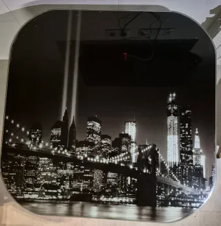 Vendo mesa de cocina de cristal con skyline de Nueva York en PERFECTO ESTADO. Esquinas redondeadas. Regalo protector de cristal de 1.5mm - Superficie de cristal. - Patas metálicas. - Medidas de 100x100 cm.