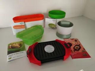 Lote completo de 5 artículos Lékué + Libro de recetas de regalo. Todo sin estrenar (sin caja original, con manuales excepto uno). Valor real en tienda superior a 100€. ¿Qué incluye el pack? - Microwave Grill: Efecto parrilla real en microondas. - Estuche de Vapor Hondo: Ideal para pescados y carnes al vapor. - Rice & Grain Cooker: Arroz y cereales perfectos en minutos. - Pasta Cooker: Cuece y escurre pasta sin ensuciar más. - Veggie Ricer: Para picar brócoli/coliflor fácilmente. REGALO: Libro "De la cocina a la mesa en 10 min" (35 recetas). Silicona Platino 100% (Libre de BPA). Aptos para lavavajillas, microondas y nevera.