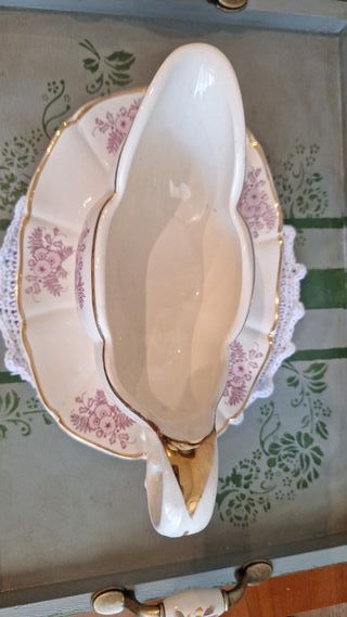 Elegante salsera de porcelana con un delicado diseño floral en tono rosa. Perfecta para añadir un toque clásico a tu mesa. - Borde con detalle dorado. Medidas 24*16* 10 - Motivo floral en la base y el cuerpo.