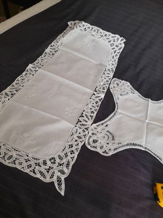 Ambos bordados a mano . Camino mide 88 x 38 cm. El de cesta de pan 42 x 41 cm. Algodón con encaje de Bruselas. Preciosos.