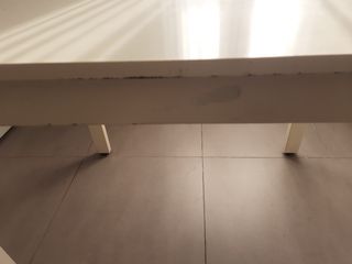 Mesa de madera maciza extensible lacada en blanco. Extensible de 1 metro a 1,60 metros , por ambos lados independientes .Esta desmontada y cabe, sin problema, en un coche.