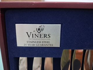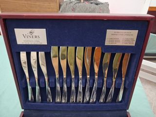 Set de cubertería de 44 piezas de la marca Viners, diseñado para 6 personas. Este elegante juego es perfecto para cualquier ocasión. - Incluye 6 cuchillos de mesa. - Incluye 6 cuchillos de postre. - Incluye 6 tenedores de mesa. - Incluye 6 tenedores de postre. - Incluye 6 cucharas de sopa. - Incluye 6 cucharillas de postre. - Incluye 2 cucharas de mesa. Todo delicadamente organizado dentro de su caja de madera NO HAGO DELIVERY, SOLO PARA RECOGER EN CASTELLON DE LA PLANA