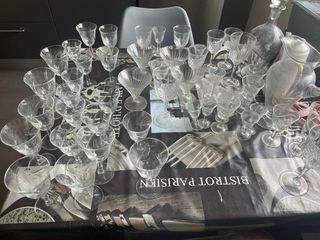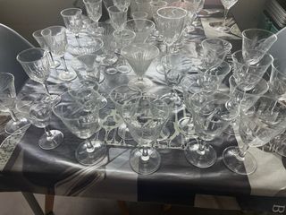 Se vende elegante servicio de Copas de Cristal de Bohemia de gran calidad, talladas a mano. Con Centro de mesa. 15 copas. 5 de Agua. 17 cm De Alto 5 de Vino. 16 cm de Alto.5 de Champán. 13 cm Alto x 10 de diámetro. Centró de mesa: 30 cm de diámetro. Servicio nuevo, nunca se uso. Envío y recogida local.