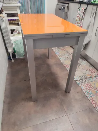 Mesa auxiliar de cocina con superficie naranja brillante. Ideal para espacios reducidos. El fondo es de 50 cm, ampliable a 90 en total. - Tablero de color naranja (cristal) - Patas de color gris. - Diseño moderno. - Aletas extensibles de 20cm cada una.