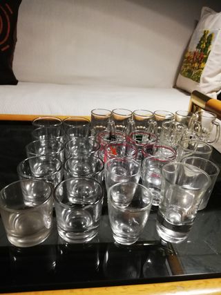 Vendo basos de chupitos, 10U. En liso con doble fondo, 6U. jarritas con asa y tallado, 4U. forma redonda dibujo rojo y negro, 3U. Estrecho por la base un poco mas ancho por arriba, 2 lisos y planitos, 1U.jarrita orijinal 1U.basito alto y eschecho con doble fondo. 1U. Es un salero de mesa cristal tallado sin estrenar. Todo 19€ sueltos preguntar precios