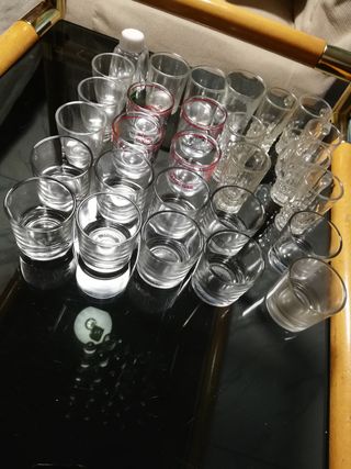 Vendo basos de chupitos, 10U. En liso con doble fondo, 6U. jarritas con asa y tallado, 4U. forma redonda dibujo rojo y negro, 3U. Estrecho por la base un poco mas ancho por arriba, 2 lisos y planitos, 1U.jarrita orijinal 1U.basito alto y eschecho con doble fondo. 1U. salero de mesa cristal tallado sin estrenar. Todo 18€ sueltos preguntar precios