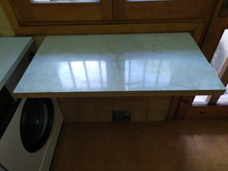 Encimera de cocina abatible con un diseño práctico y funcional. Perfecta para optimizar el espacio. Está bien anclada y por su solidez sirve de mesa. Medidas 181cm de ancho x 50cm de fondo x 3 cm de grosor. Una vez abatida tiene una profundidad de 9 cm. Se recoge en Collado Villalba. 4 soportes para permitir el plegado. - Acabado mármol. - Mecanismo abatible para fácil almacenamiento.