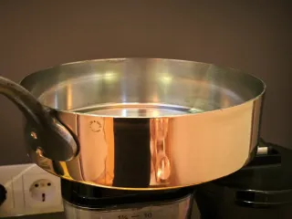 Sauteuse de cobre francesa fabricada en Villedieu por Atelier du Cuivre, taller artesanal reconocido internacionalmente. Diámetro 24 cm, altura 6 cm. Peso 1.885 g. Espesor del cobre aprox. 1,8–1,9 mm. Mango tradicional de hierro fundido. Interior con estaño nuevo en excelente estado, lista para usar. Exterior limpio con ligeras marcas normales de uso. Diseñada para pasar cómodamente de la placa al horno y a la mesa. Ver mi perfil para una sartén de cobre de 30 cm a juego.