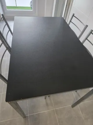 Vendo mesa de cocina y 4 sillas. De metal gris, y cubierta en vidrio negro Medidas.. 1 m x 0,50. Se abre al doble de ancho. Muy robusta y sin apenas uso.