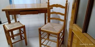 MESA DE COCINA compuesta por mesa de extensible de 1,10 a 1,60 metros con cajón. Cuatro sillas de madera de haya maciza y un taburete en madera de haya. En buenas condiciones, con poco uso. Todo el conjunto por 220 euros