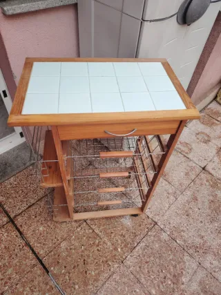 Carrito auxiliar de madera con mesa y cestas. - Estructura de madera. - Cajón superior. - Varias cestas metálicas. - Ruedas para fácil movilidad. Ruedas de repuesto de regalo Precio algo negociable no mucho Abstenerse gente que quiera q lo regale