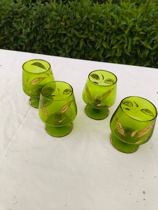 Elegante juego de cuatro copas de cristal. Presentan un precioso color verde y detalles dorados. Son ideales para darle un toque vintage a tu mesa. - Diseño con hojas doradas. - Perfectas para licor o postres.