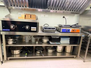 Mesas de trabajo de acero inoxidable con dos estantes inferiores para almacenamiento. - Estructura robusta de metal. - Diseño de dos niveles. - Superficie amplia para preparación de alimentos. MEDIDAS 2000*700*850 MM