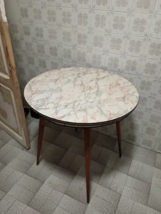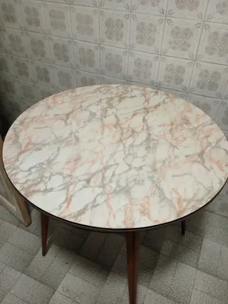 Elegante mesa redonda con un diseño efecto mármol veteado en tonos rosados y blancos. Sus patas de madera le dan un toque cálido y estilizado. - Tablero con acabado imitación mármol. - Patas de madera robustas. Tiene muchos años pero está en buen estado