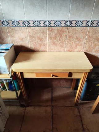 Mesa plegable útil para aprovechar espacios. Robusta, hecha de madera. Súper fácil de abrir y cerrar (se puede hacer con el pie incluso). Sin ningún picado ni desperfecto. Sirve como mesa de estudio/juegos para habitación infantil o también como mesa auxiliar en cocina. Medidas mesa plegada: 80cm de largo, 75cm de alto, 18cm de ancho. Medidas mesa abierta: 80cm de largo, 75cm de alto y 135cm de ancho.