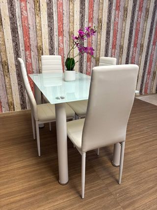 ☎️ 680*558*196 🍽️ Mesa de Comedor Blanca de Cristal + 4 Sillas – NUEVA Vendo mesa de comedor nueva con 4 sillas blancas a juego, de diseño moderno y elegante. Mesa con tablero de cristal templado y estructura blanca, ideal para cocinas y comedores actuales. Las sillas tapizadas en color blanco aportan comodidad y estilo, fáciles de limpiar y perfectas para el uso diario. C 📏 Medidas mesa: • Largo: 110 cm • Ancho: 70 cm • Alto: 74 cm 📏 Medidas sillas: • Alto: 95,5 cm • Ancho: 40 cm • Profundidad: 40 cm ✨ Características destacadas: ✔️ Producto NUEVO ✔️ Mesa de cristal templado