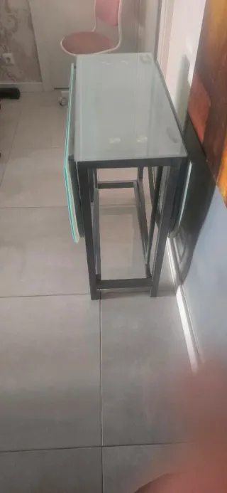 Elegante mesa con superficie de cristal y estructura metálica.A recoger en la Avenida del Puerto - Diseño moderno y funcional. - Combina cristal transparente y metal gris.
