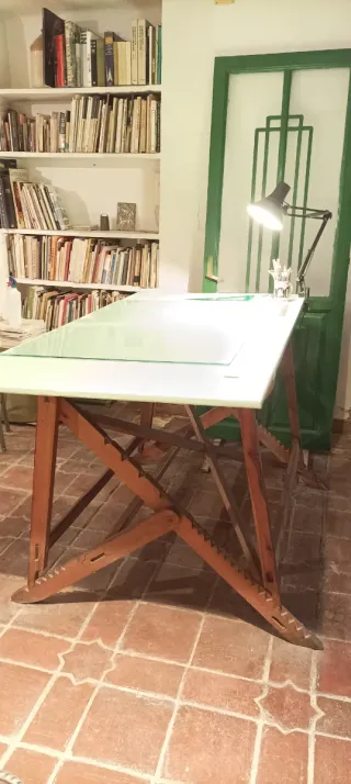 Vendo mesa de dibujo técnico en buen estado, ideal para arquitectos, diseñadores, ilustradores o estudiantes de bellas artes. • Tablero blanco amplio (aprox. 100-70 cm) con regla-paralela. • Altura aprox 104 con el tablero plegado. • Estructura metálica estable, con patas firmes y posibilidad de inclinación/regulación del ángulo (ver en mecanismo de fijación en foto). • Algunas señales de uso visibles (bordes del tablero, desgaste en mecanismo) pero funciona perfectamente.