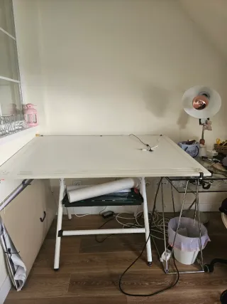 Se vende tan barata por mudanza urgente. Mesa de dibujo técnico profesional con superficie inclinable. Ideal para artistas y diseñadores. - Estructura robusta. - Superficie amplia para trabajar cómodamente. - Ajuste de inclinación para mayor versatilidad. se incluye lampara y taburete en el precio