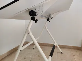 Mesa de dibujo profesional con tablero blanco amplio de madera y estructura metálica blanca fija integrada (no desmontable, va toda unida como se ve en fotos). Inclinación regulable del tablero (0-45° con topes y mecanismo seguro), altura fija pero cómoda (aprox. 75-90 cm), se inclina totalmente hacia atrás para plegado compacto. Muy estable y versátil: perfecta para dibujo técnico, diseño gráfico, artistas, arquitectos o escritorio extra. En excelente estado, poco uso, montada y lista. Recogida en mano en Castellón de la Plana zona hospital provincial. Medidas aproximadas 120x60 cm