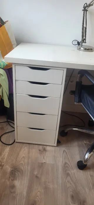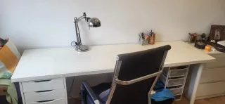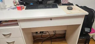 Mesa de estudio de Ikea con un diseño moderno y funcional. Cuenta con una práctica cajonera integrada para organizar tus pertenencias. - Amplia superficie de trabajo. - Cajonera con dos cajones. - Patas robustas para mayor estabilidad.
