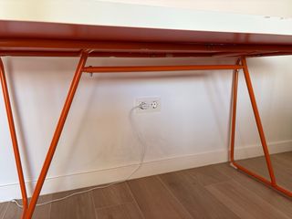 Mesa de estudio con superficie naranja y estructura blanca. - Patas metálicas en forma de V. - Diseño moderno y funcional.