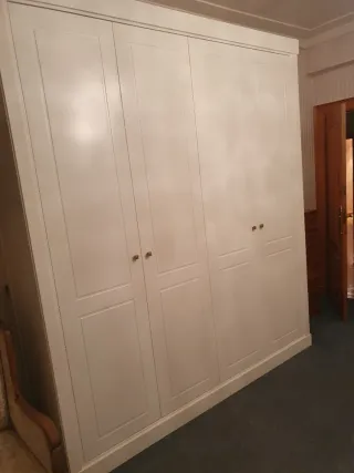 Conjunto de muebles de dormitorio que incluye un armario, dos mesitas de noche y una mesa de estudio. - Armario de gran capacidad con puertas. - Dos mesitas de noche a juego. - Mesa de estudio funcional.
