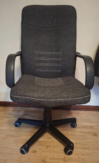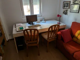 Silla de estudio acolchada con tapicería en perfecto estado. Su diseño ofrece comodidad para largas jornadas. - Respaldo alto. - Brazos ergonómicos. - Base con ruedas para fácil movilidad. Mesa escritorio con 2 alturas para ordenador. Buen estado