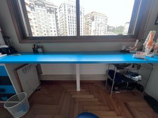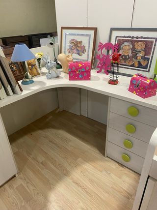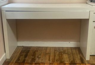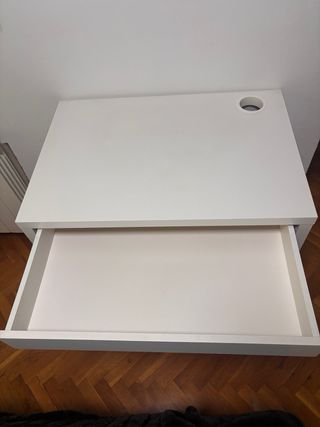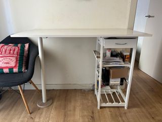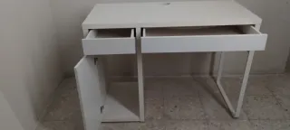 Escritorio funcional para estudiar o trabajar. - Diseño moderno en blanco. - Fabricado con materiales resistentes. Un poco sucio pero le doy un repasito y queda como nuevo. No me acuerdo dónde guarde el manual de montaje pero es fácil de montar.