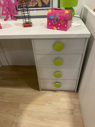 Mesa de estudio en forma de rincón, ideal para optimizar el espacio. Su diseño combina acabados blancos y detalles en tirador color pistacho - recogida en domicilio - Estructura principal de madera. - medida 120x150x 52 - Diseño moderno y funcional. - modulo cuatro cajones