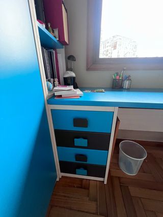 Conjunto de mobiliario para estudio o habitación juvenil - Mesa de estudio con superficie azul.medidas fondo 54 y largo 2,60 - Armario con cajones en azul y negro.cajonera mefidas :ancho 42 y slto 72 - Estantería a juego.medidas 150 de alto y 17 ancho con 3 estantes
