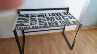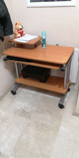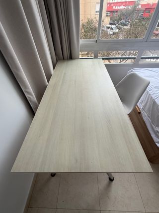 Mesa versátil para estudio o trabajo, fácil de mover gracias a sus ruedas que tienen frenos. Todas se mueven bien. - Superficie de madera. - Patas de metal. - Ruedas de plástico.