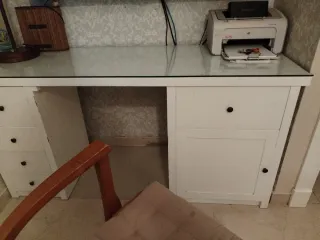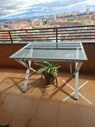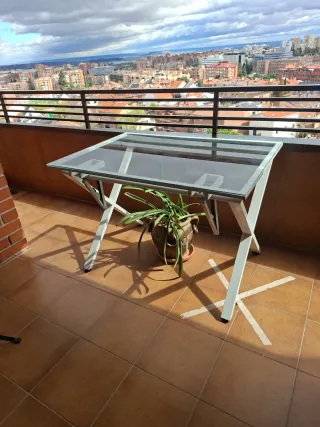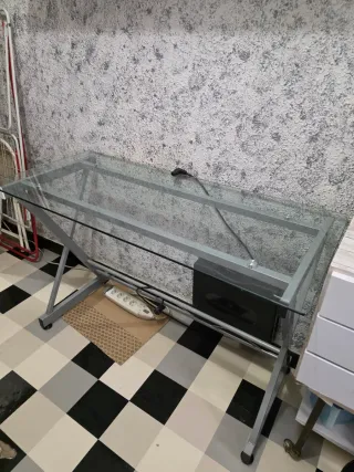 Mesa de estudio con superficie de cristal y estructura blanca. Sus dimensiones son 140cm de largo, 70cm de ancho y 77cm de alto. - Superficie de cristal. - Estructura de madera. Telf 686718718