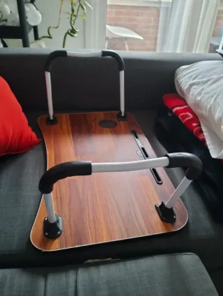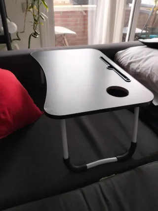 Mesa portátil plegable para usar en la cama o en el sofá. Superficie con acabado tipo madera, hueco para vaso y ranura para tablet o móvil. Patas plegables con agarre antideslizante. Muy práctica para trabajar, estudiar o desayunar. Pequeño signos de uso que no afectan su funcionamiento.
