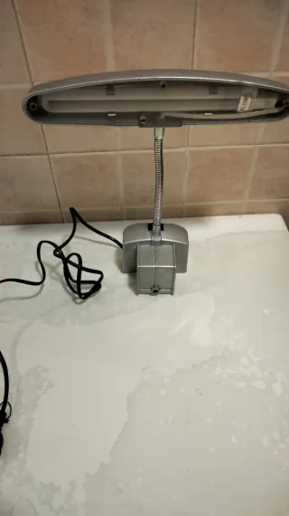 Flexo de diseño moderno, perfecto para tu escritorio o mesa de estudio. Su brazo flexible te permite dirigir la luz fácilmente. - Acabado en color plateado y negro. - Fabricado con materiales resistentes.Le falta el tornillo de ajuste