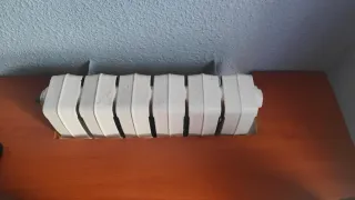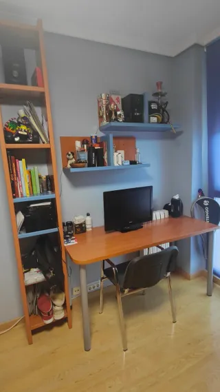 Conjunto de mesa de estudio con estanterías integradas. Ideal para organizar tu espacio de trabajo o estudio. - Estructura principal de madera. - Patas y soportes metálicos. Estantería pie 240x36x28 Estanterías colgar 31x80x28 Mesa altura regulable patas 145x63 La mesa tiene un recorte para encajar con radiador Armario a juego también disponible en venta