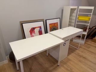 Conjunto de mobiliario de oficina y almacenamiento. - Escritorio MICKE con cajón. Escritorio infantil. - Mesa LINNMON 100x60cm con 4 patas (este tablon esta algo deteriorado en un canto, se aprecia en lafoto) - dos Estantería TROFAST con tres baldas y un cajon amarillo. El pvp de todos los muebles es de 220€ y lo dejo todo por 50€. Quizas encuentre algun cajon de plastico de los grandes. No hago envios. A recoger en Salinas. Lo vendo porque hemos cambiado la mesa de estudio y su estanteria.