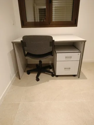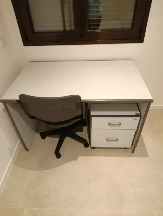 Conjunto de escritorio con cajonera y silla de estudio. - Escritorio de color gris claro con estructura gris. 120cmx 80cm - Cajonera con dos cajones. - Silla de estudio con ruedas.