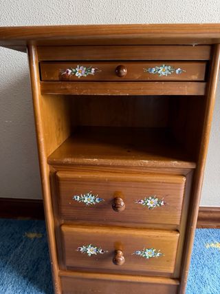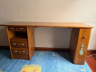 Mesa de estudio de madera. - Cuenta con varios cajones para almacenamiento. - Presenta detalles decorativos florales. - Acabado en tono madera natural. Medidas Ancho 153 cm Alto 74 cm Fondo 50 cm Signos de uso.