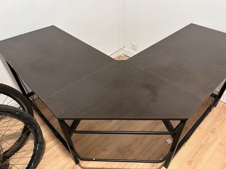 Mesa de escritorio en forma de L, ideal para optimizar el espacio en tu oficina o estudio. Su diseño moderno se adapta a cualquier ambiente. - Dimensiones 150cm x 150cm - Estructura metálica robusta. - Superficie de madera oscura.